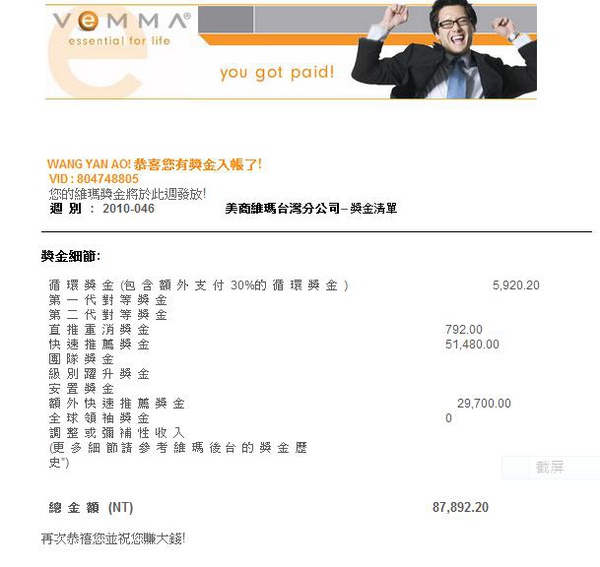 心潔本周直推6個金級會員,金級很難嗎?其實很簡單,當你自己是金級會員你自然會極力推薦金級會員,你的下線也一樣,只要這樣複製下去你的組織將會是難以置信的大爆發!所以在24周的免重消期內找4個金級難嗎?一點都不難,心潔一個禮拜推薦6個,你半年推薦4個都沒有嗎?不可能!除非你什麽都不做!!只要你願意去努力去付出你所得到的回報就會跟心潔一樣,讓自己都意想不到!!